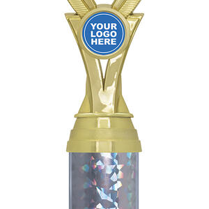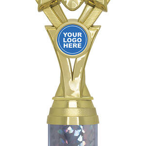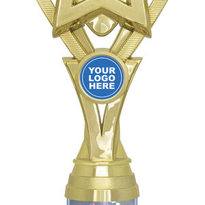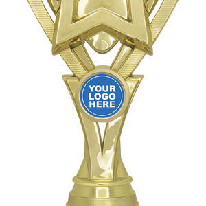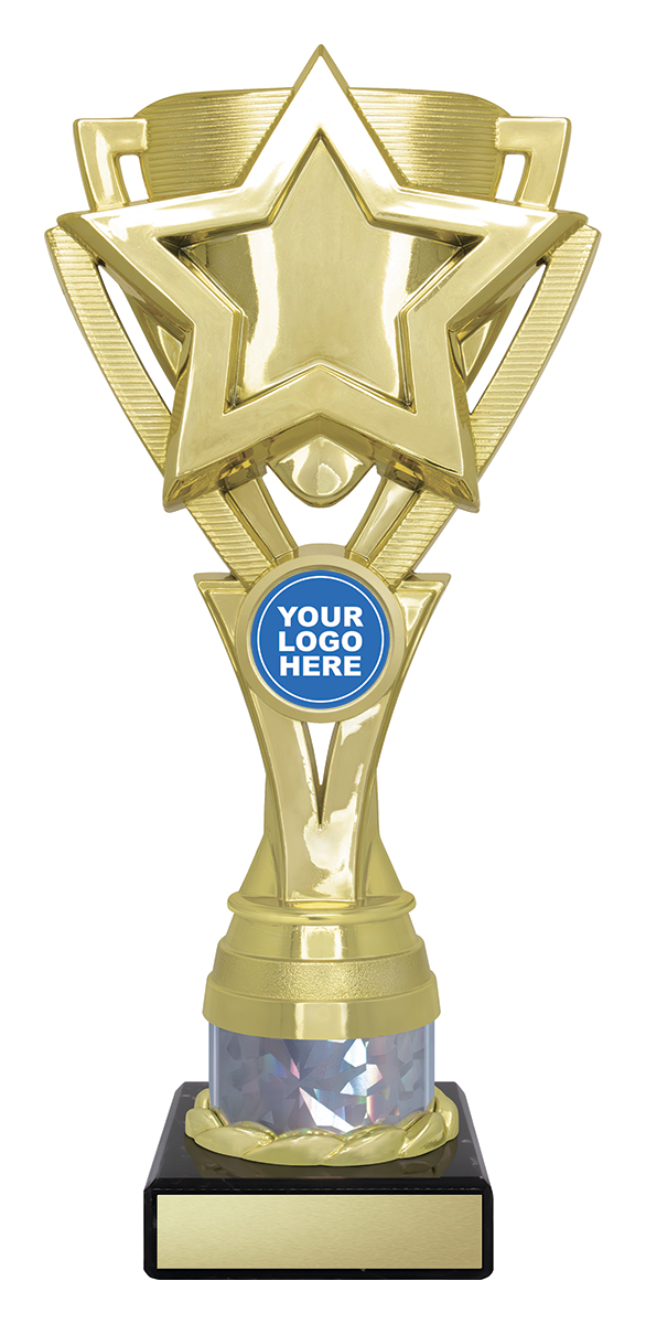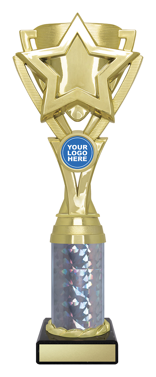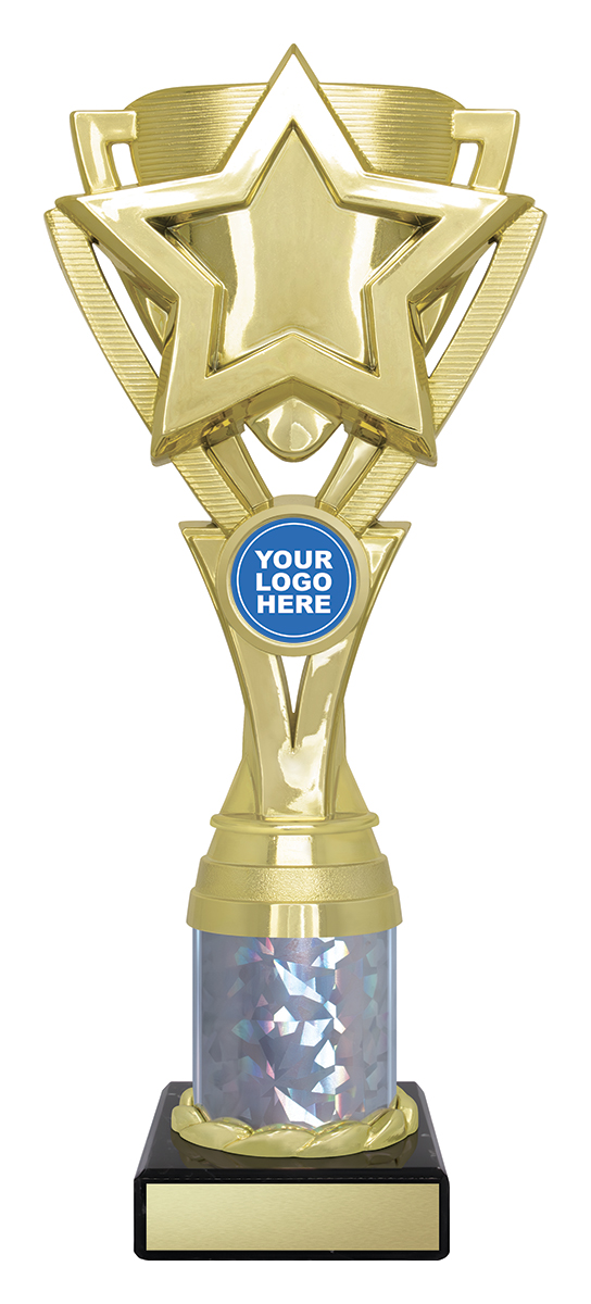 This sports trophy cup presents a sophisticated blend of gold, black, and silver finishes, highlighted by its distinctive star motif. Expertly crafted from durable plastic and marble, it features a striking holographic column and an area for custom logo placement. Its contemporary design makes it a trusted choice for recognising broad achievement across educational and sporting contexts.