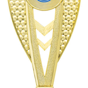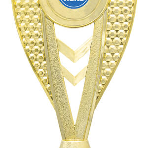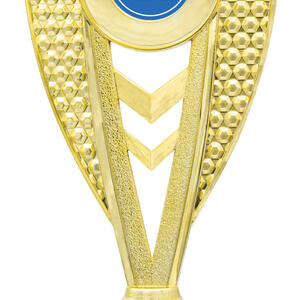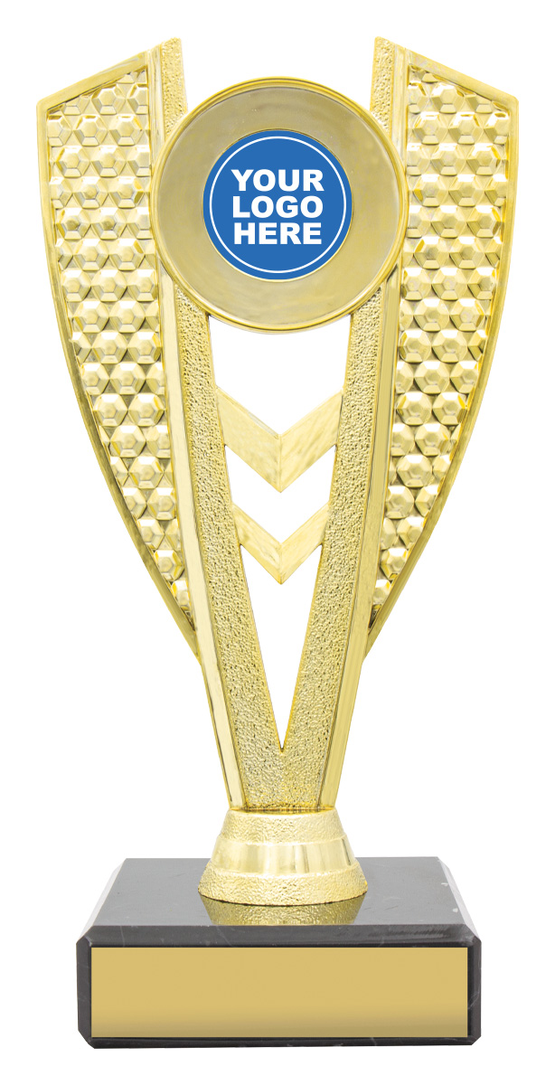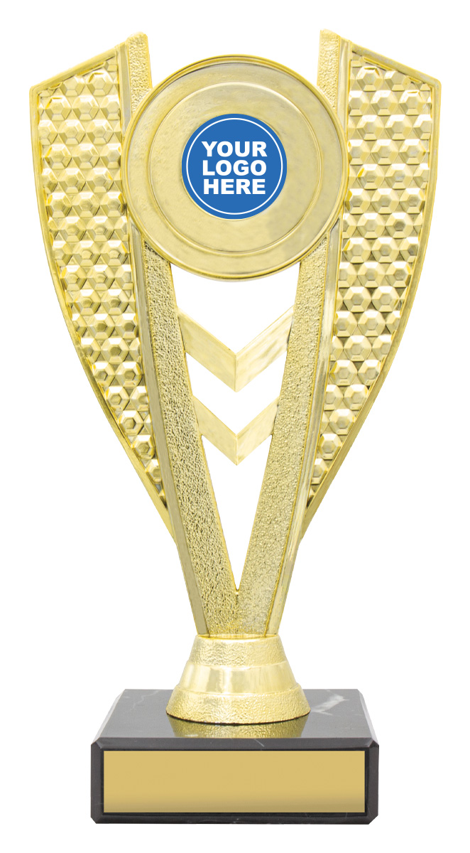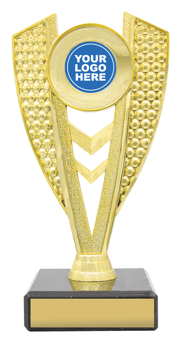 Striking in gold and black, this sports trophy combines a contemporary circular top with angular sides for a memorable presentation. Crafted from plastic, and marble, it delivers both durability and refined style. The customisable logo area and generous rectangular base offer flexibility for personalisation, making it suited to any general sports achievement or team celebration.