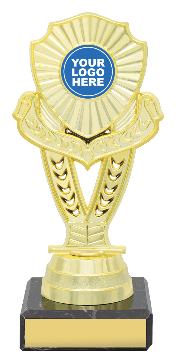 This trophy with logo offers a refined way to recognise achievement across any field. Crafted with a distinctive shield shaped top and cylindrical base, its gold and blue accents complement a black marble textured foundation. The customisable logo area allows for tailored recognition, making it an elegant and versatile choice for schools, teams, or corporate awards programmes.