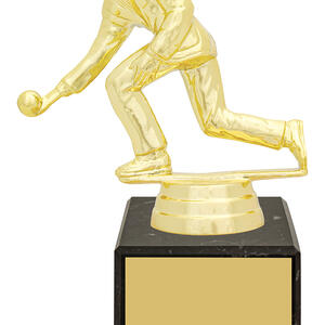A striking choice for any bowls event, this lawn bowls trophy pairs a golden bowler figurine in action with a deep black marble base. Crafted from quality plastic and marble, it showcases refined contrast and enduring design. The base provides a dignified platform for recognising achievement in the sport.