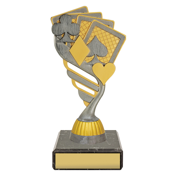 The Flare Cards Trophy showcases a modern sculptural design in silver with a gold poker card medallion. Its flowing form adds movement and energy, making it a standout award for poker, bridge, or gaming nights.