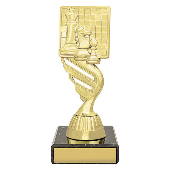 Sleek and distinguished, this chess trophy features a striking spiral base crafted from plastic and marble, finished in classic gold and black. The top showcases detailed chess pieces and a chessboard design, creating a memorable tribute to strategic excellence. Ideal for recognising achievement in chess, it offers an elegant symbol of skill and dedication.