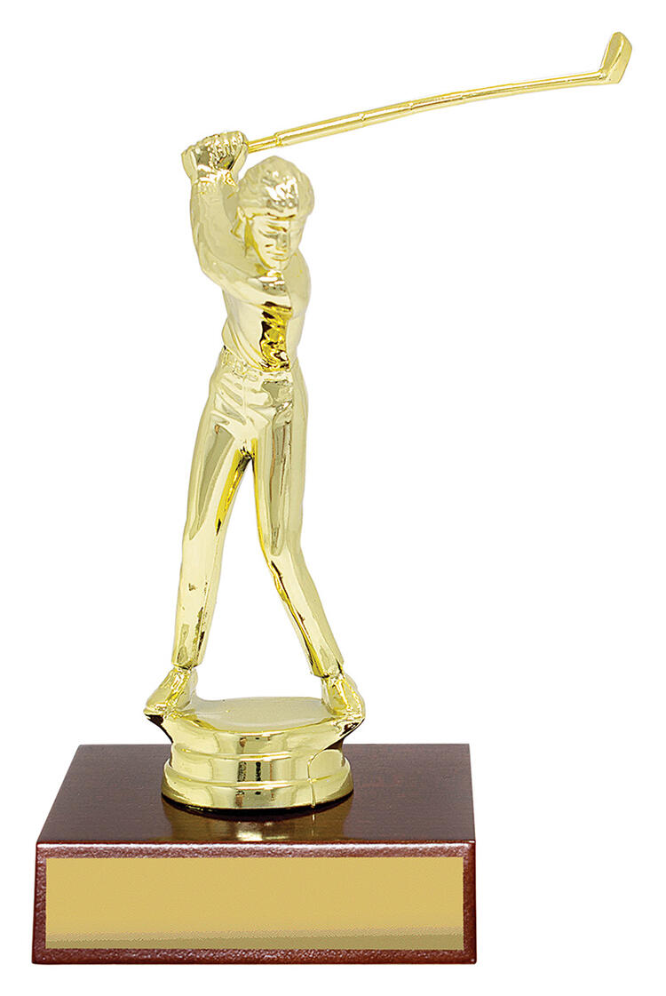 This golf trophy showcases refined craftsmanship with its striking gold and brown finish, complemented by a sturdy rectangular wooden base and a detailed plastic figurine. The thoughtful combination of materials creates a lasting symbol of achievement, making it an excellent choice for recognising standout performance on the course. Designed for lasting impact, it is ideal for prestigious golf presentations.