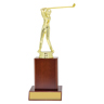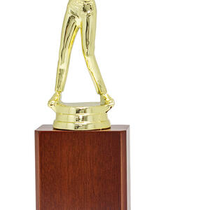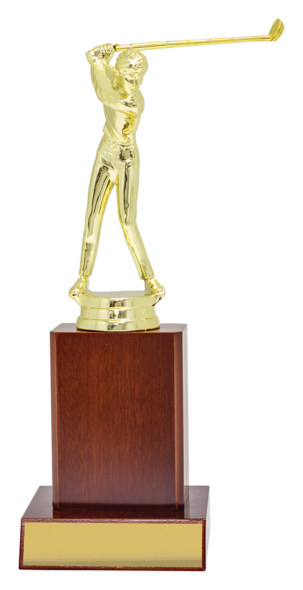 This classic golf trophy features a polished gold golfer in mid-swing, mounted on a rich timber base. Perfect for tournaments, club events, or individual recognition. Engraving plate included.