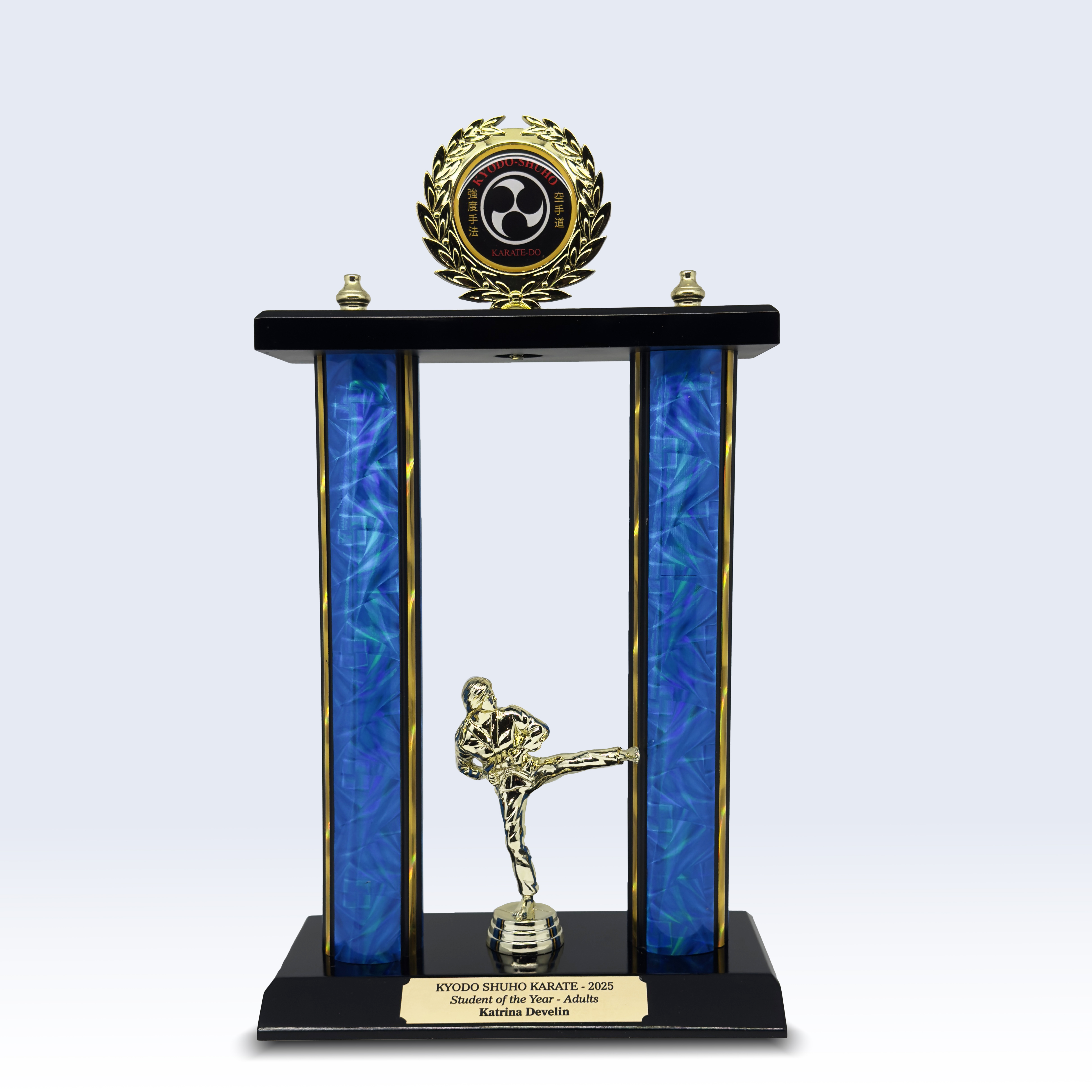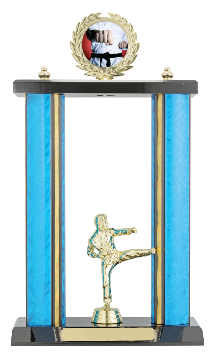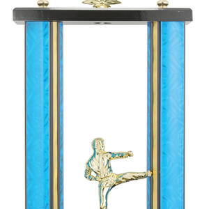 Celebrate outstanding achievement in martial arts with this distinguished martial arts trophy. Featuring a dynamic kicking figurine and a martial arts themed emblem, this award stands out with its elegant combination of blue, gold, and black. The refined design, crafted from durable plastic, is set on a rectangular base with vertical columns and a circular top ornament, making it a memorable recognition piece.