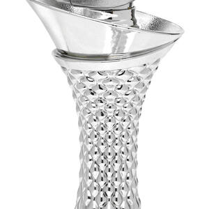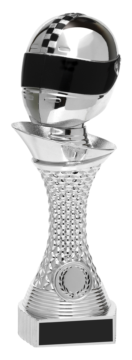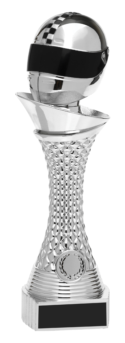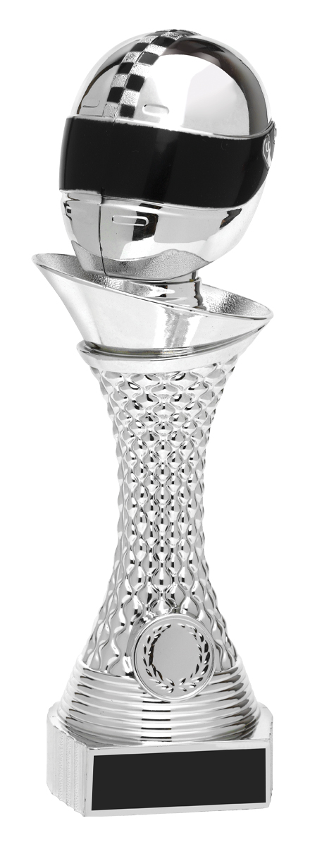 This motorsport trophy stands out with a helmet-shaped top, finished in sleek silver and black tones. A textured base supports the detailed helmet featuring a classic chequered pattern, evoking the thrill and tradition of racing. Crafted for lasting recognition, this motocross trophy is a professional and elegant choice for celebrating achievement in motorsport.