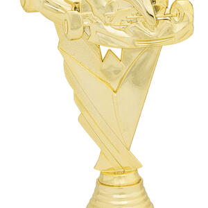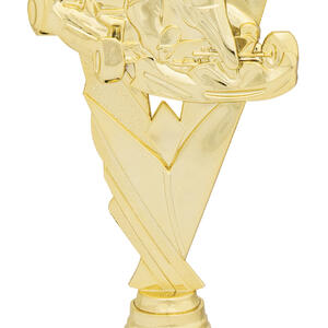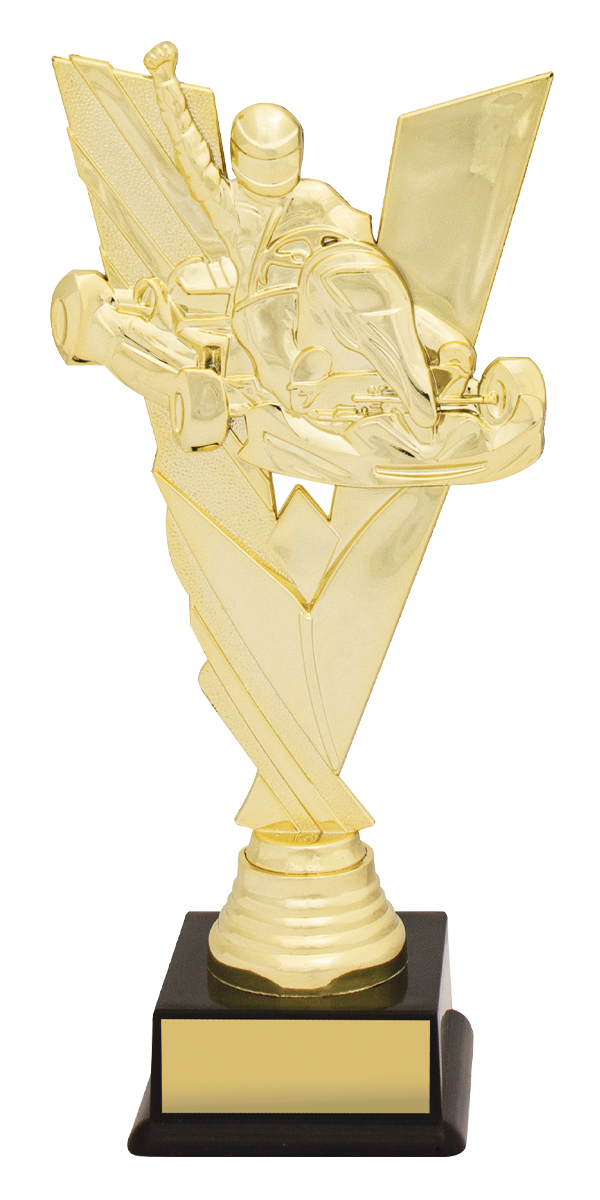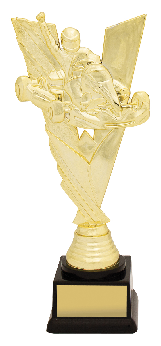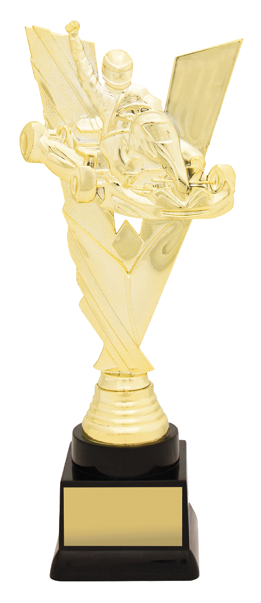 Celebrate motorsport achievement with this go kart trophy, featuring a detailed figurine of a racer captured in a triumphant pose. The gold and black colour scheme, combined with durable plastic construction, creates a professional and memorable award. A black base completes the design, making it an ideal choice for recognising excellence in go karting events.