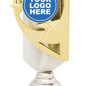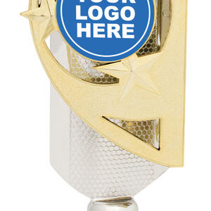 This motorsports trophy features a refined combination of gold, silver and black for a distinguished presentation. The circular emblem, surrounded by striking star motifs, provides a dynamic space to showcase a custom logo, while the sturdy marble and plastic construction ensures lasting recognition. An elegant base accommodates further personalisation, creating a memorable award for general achievement.