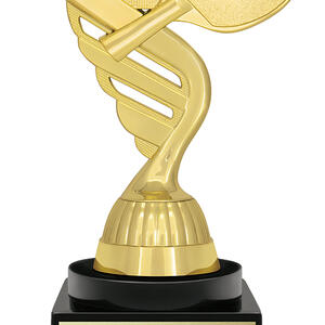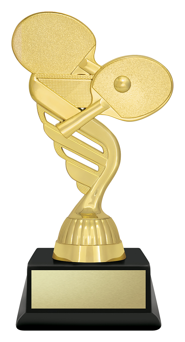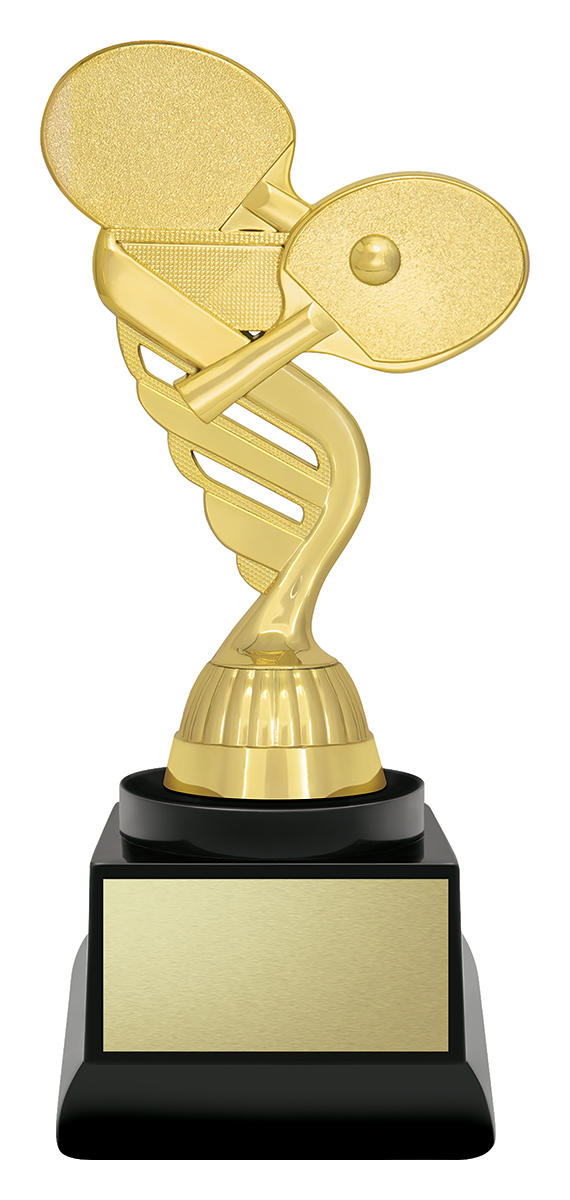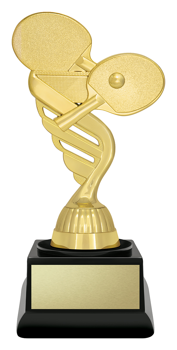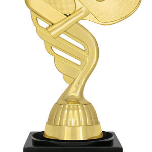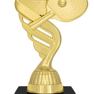 This table tennis trophy features a striking gold and black finish, with two detailed paddles and a ball set atop a solid black base. Crafted from a mix of plastic, it offers a durable and elegant way to recognise achievement in table tennis. Its classic design makes it a memorable choice for competitions and club presentations.