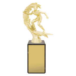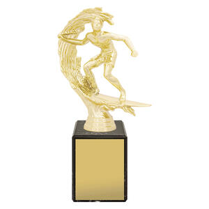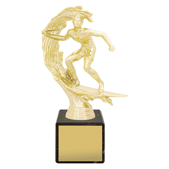A dynamic surfing trophy showcasing a detailed surfer riding a wave. Finished in antique gold and mounted on a genuine marble base, itÂ’s a standout award for surf comps or club presentations. Supplied with engraving plate.
