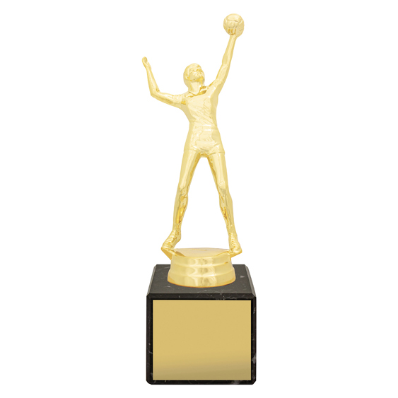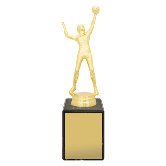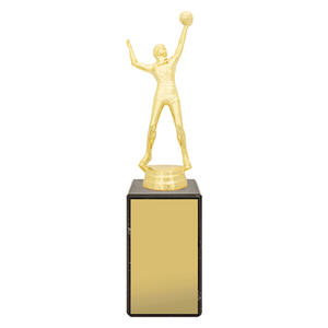 This male volleyball trophy features a detailed player figure in striking action pose. Crafted in antique gold finish and mounted on a solid marble base, itÂ’s ideal for club awards, tournaments, and MVP presentations. Includes engraving plate.