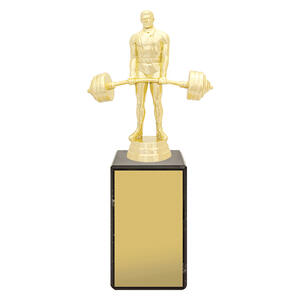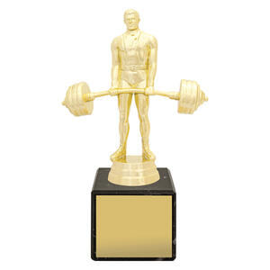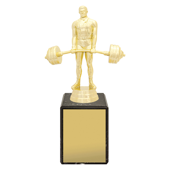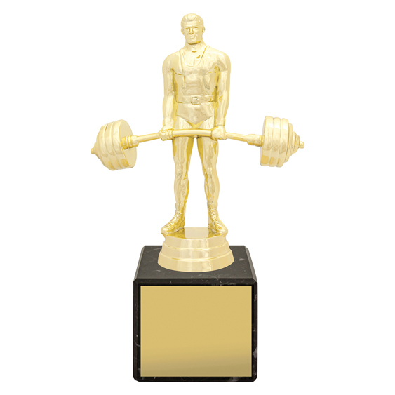 The Weightlifting Marble Column Trophy features a bright gold weightlifter figure mounted on a genuine European marble base. A timeless and elegant choice for strength and fitness awards and club presentations.