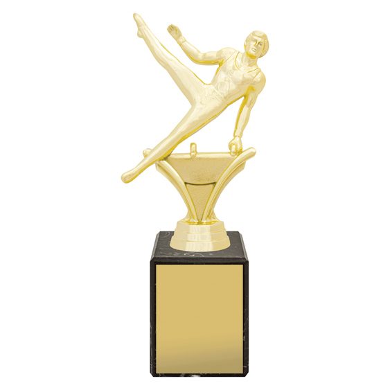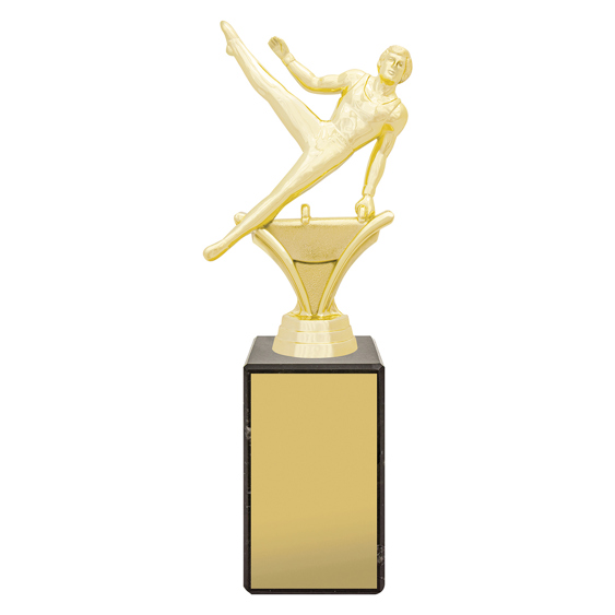 The Male Gym Marble Column Trophy features a gold gymnast figure on a polished marble base-refined and traditional for club nights and school awards.