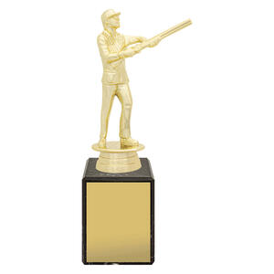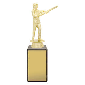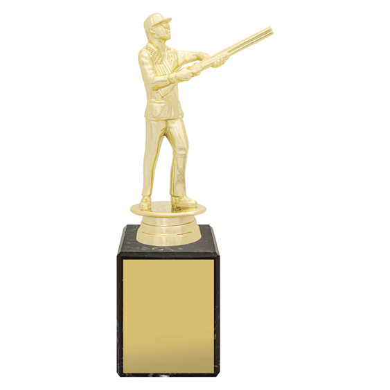 The Male Skeet Marble Column Trophy features a bright gold shooter figure on a premium marble base. Its classic design makes it an ideal choice for mens skeet awards and club presentations.