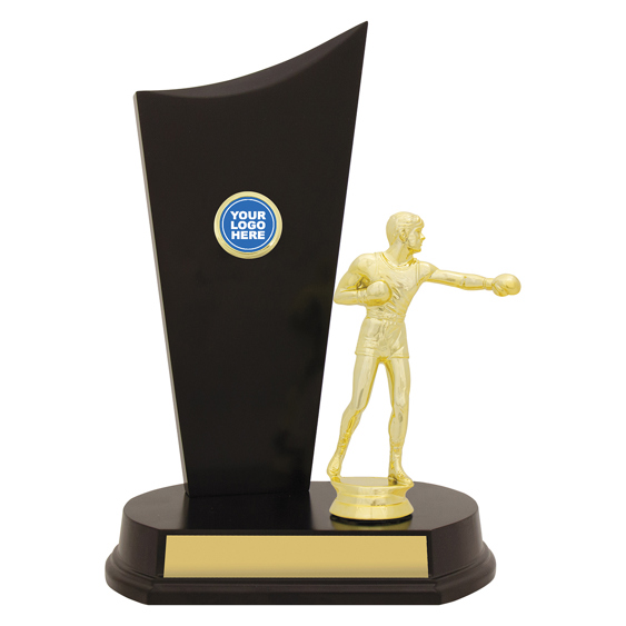 Classic boxing trophy featuring a gold boxer figure in mid punch, mounted beside a tall black panel with a logo area. This contemporary design combines bold contrast and clean lines, perfect for boxing tournaments or gym awards.